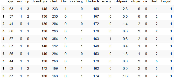 Overall, Table 2 shows the effectiveness of many machine-learning approaches for early HD detection. The proposed EHDD model shows promising results with its high accuracy and dimensionality reduction capability. The data is organized in a tabular format in Fig. (2) with 10 columns and 10 rows. Each row signifies a different patient, and each column represents a specific attribute or feature related to the patient's health. The dataset encompasses a variety of patient attributes that contribute to the diagnosis of HD. Demographic information includes age and sex. Medical history features consist of chest pain type (cp), fasting blood sugar (fbs), and resting electrocardiographic results (restecg). Vital signs such as resting blood pressure (trestbps), cholesterol level (chol), and maximum heart rate during exercise (thalach) provide essential physiological data. Exercise-induced changes are captured through variables like exercise-induced angina (exang), ST depression induced by exercise (oldpeak), and the slope of the peak exercise ST segment (slope). The diagnostic test results include major vessels involved (ca) and the Thallium stress result (thal). The target variable is the presence of heart disease (target), which identifies whether a patient was diagnosed with HD.