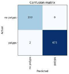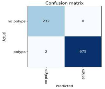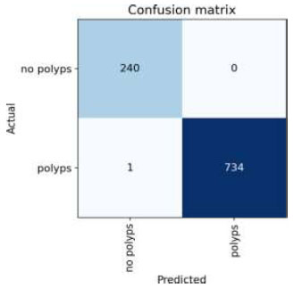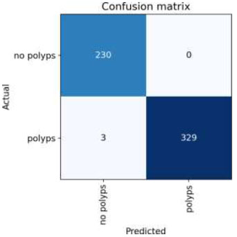 Table 9 presents the epochs loaded. The training loss indicates how well the model fits the training data, and the validation loss indicates how well the model fits the new data. The training and validation losses are shown in Figs. (16 and 17). (Fig. 17) illustrates the confusion matrix, and Fig. (18) shows the image classification of polyps and non-polyps using ResNet50.
