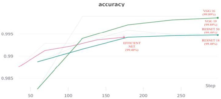 The comparative accuracy plots of the proposed models are given in Fig. (27). From this, the accuracies of VGG16, VGG19, ResNet18, ResNet50, and EfficientNet are 99.89%, 99.46%, 99.48, 99.64%, and 99.64%. From the above results, we can conclude that VGG16 has the best accuracy.