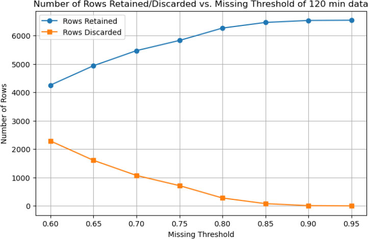 • 120-Minute Data: A similar trend is observed, although even at θ = 0.60, a larger portion of rows (over 4,000) is retained compared to the 30-minute dataset. This suggests that the 120-minute dataset contains fewer high-missingness rows or generally more complete measurements. By θ = 0.95, over 6,300 rows are retained, and only a small fraction are removed (Fig. 4).