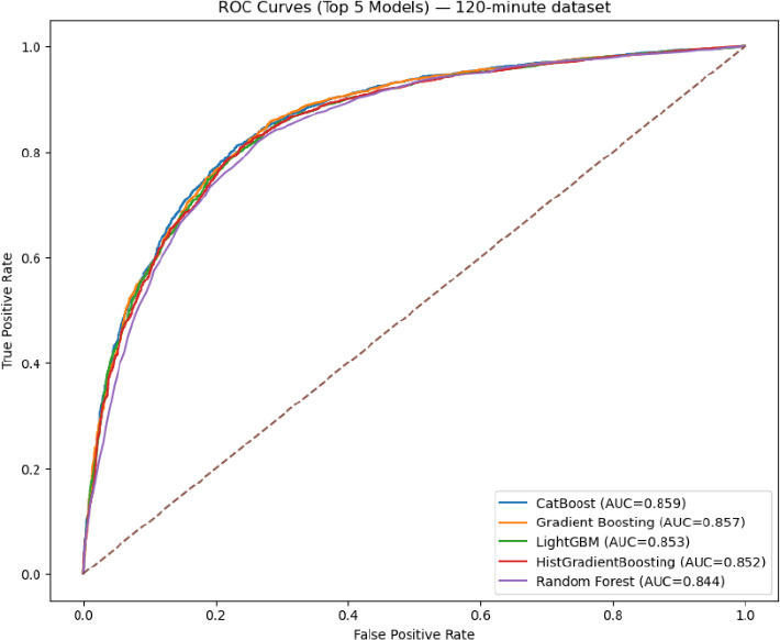 When the time window was extended to 120 minutes, Gradient Boosting models exhibited the highest average F1-score (~0.7983) and displayed excellent calibration. This improvement likely stems from the greater data richness at 120 minutes: additional laboratory results, updated vital signs, and more time for hemodynamic fluctuations can allow gradient-boosted ensembles to better capture complex, nonlinear relationships. Nonetheless, CatBoost, Random Forest, and certain neural network models also demonstrated strong discriminatory ability (F1-scores typically above 0.76), suggesting that multiple algorithmic families can achieve clinical usefulness once sufficient data become available. The key difference was that Gradient Boosting achieved slightly higher, more consistent cross-validation scores across accuracy, precision, and recall.