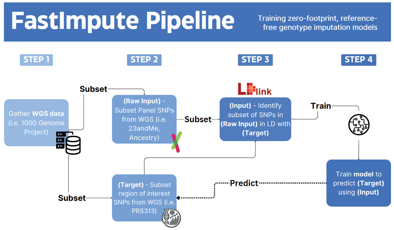 The FastImpute pipeline illustrated with PRS313_BC as an example. The pipeline comprises four key steps. Step 1: Gather Whole Genome Sequencing (WGS) data (e.g., from the 1000 Genomes Project). Step 2: Subset the panel SNPs from WGS data to include only those present in platforms like 23andMe and AncestryDNA, and a region of interest like PRS313. This subset serves as the raw input and target (output) for the model. Step 3: Using LDlink, identify a subset of SNPs in the raw input that are in linkage disequilibrium (LD) with the target SNPs (PRS313). These SNPs in LD with the target SNPs serve as the input for model training. Step 4: Train the model to predict the target SNPs using the input SNPs.
