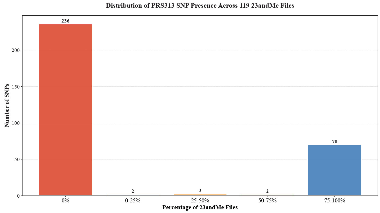 Distribution of PRS313_BC SNP Presence Across 119 23andMe Files from OpenSNP [14]. The bar chart shows the distribution of the presence of PRS313_BC SNPs across 119 23andMe V5 chip files. In total, 77 SNPs were found to be present within the 23andMe V5 chip. The x-axis represents the percentage of 23andMe files containing each SNP, divided into five ranges: 0%, 0-25%, 25-50%, 50-75%, and 75-100%. The y-axis indicates the number of SNPs within each range. A significant number of SNPs (236) are not present in any of the files (0%), while 70 SNPs are present in 75-100% of the files. The other ranges (0-25%, 25-50%, and 50-75%) contain very few SNPs, with counts of 2, 3, and 2, respectively. This distribution highlights the variability and inconsistency in SNP presence across different 23andMe V5 chip datasets.