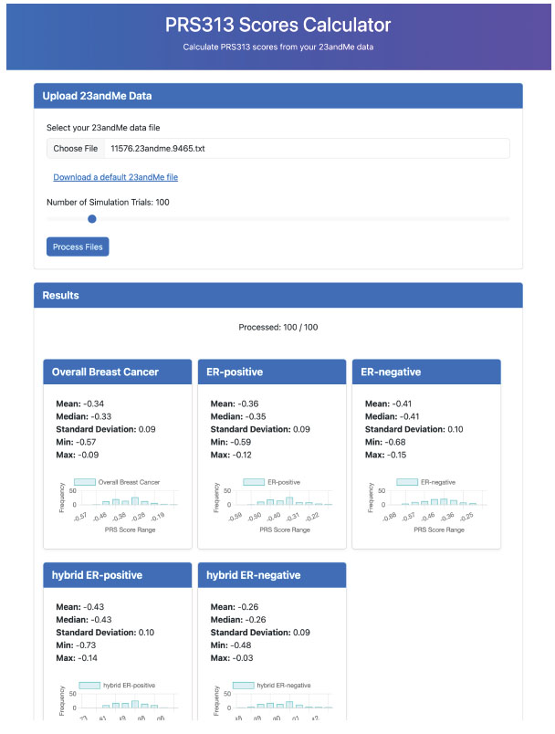 The PRS313_BC Scores Calculator interface. This website displays the results of the PRS calculations for various breast cancer phenotypes based on user's 23andMe genotype data. Users can upload their 23andMe data file and specify the number of simulation trials to process their PRS313_BC scores. The results section displays the processing status and the calculated PRS scores for five breast cancer phenotypes: Overall Breast Cancer, ER-positive, ER-negative, hybrid ER-positive, and hybrid ER-negative. Each phenotype panel includes statistical summaries of the PRS scores, such as mean, median, standard deviation, minimum, and maximum values, along with a histogram showing the distribution of PRS scores across the simulation trials. For more information, please see section 2.4.