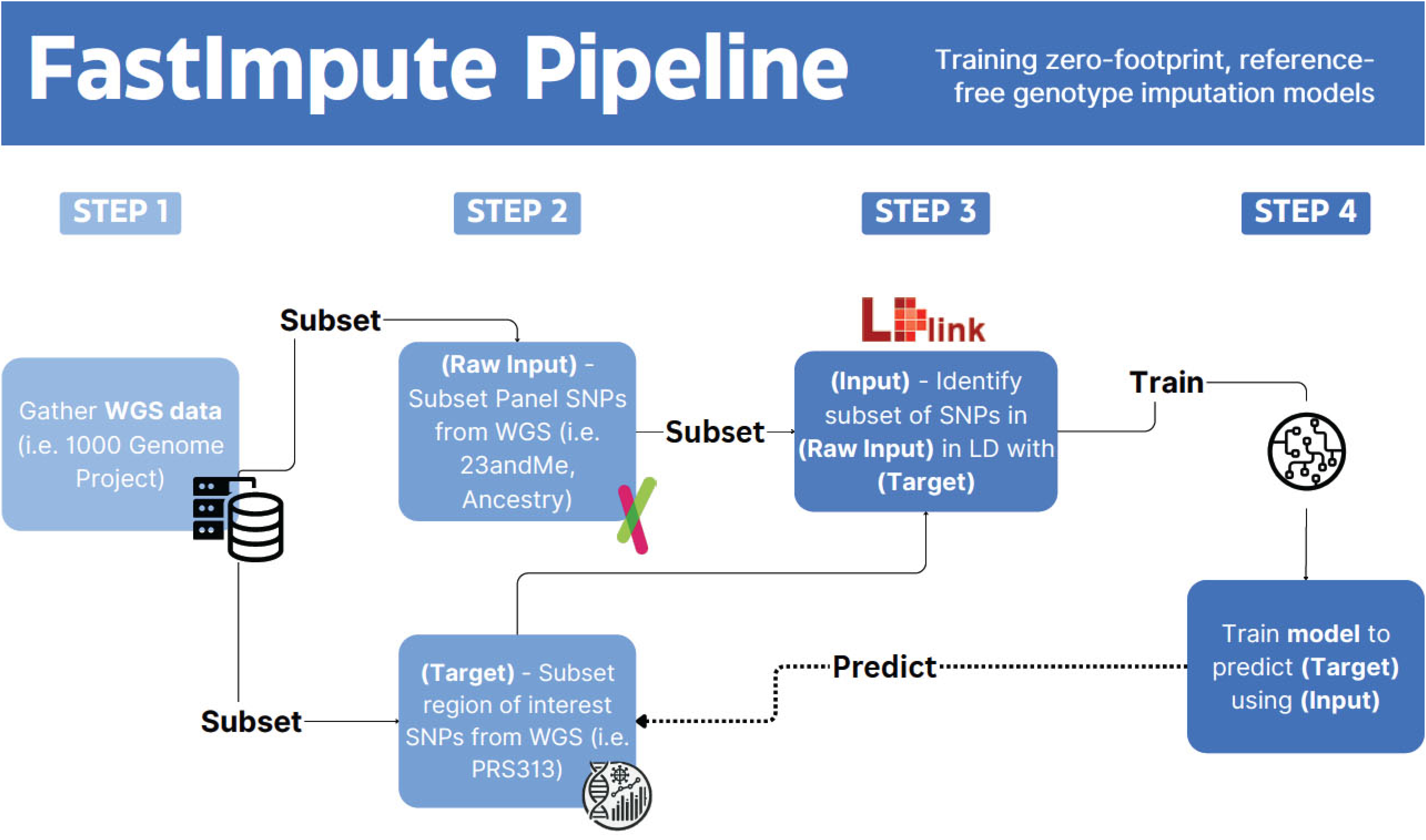 The FastImpute pipeline illustrated with PRS313_BC as an example. The pipeline comprises four key steps. Step 1: Gather Whole Genome Sequencing (WGS) data (e.g., from the 1000 Genomes Project). Step 2: Subset the panel SNPs from WGS data to include only those present in platforms like 23andMe and AncestryDNA, and a region of interest like PRS313. This subset serves as the raw input and target (output) for the model. Step 3: Using LDlink, identify a subset of SNPs in the raw input that are in linkage disequilibrium (LD) with the target SNPs (PRS313). These SNPs in LD with the target SNPs serve as the input for model training. Step 4: Train the model to predict the target SNPs using the input SNPs.