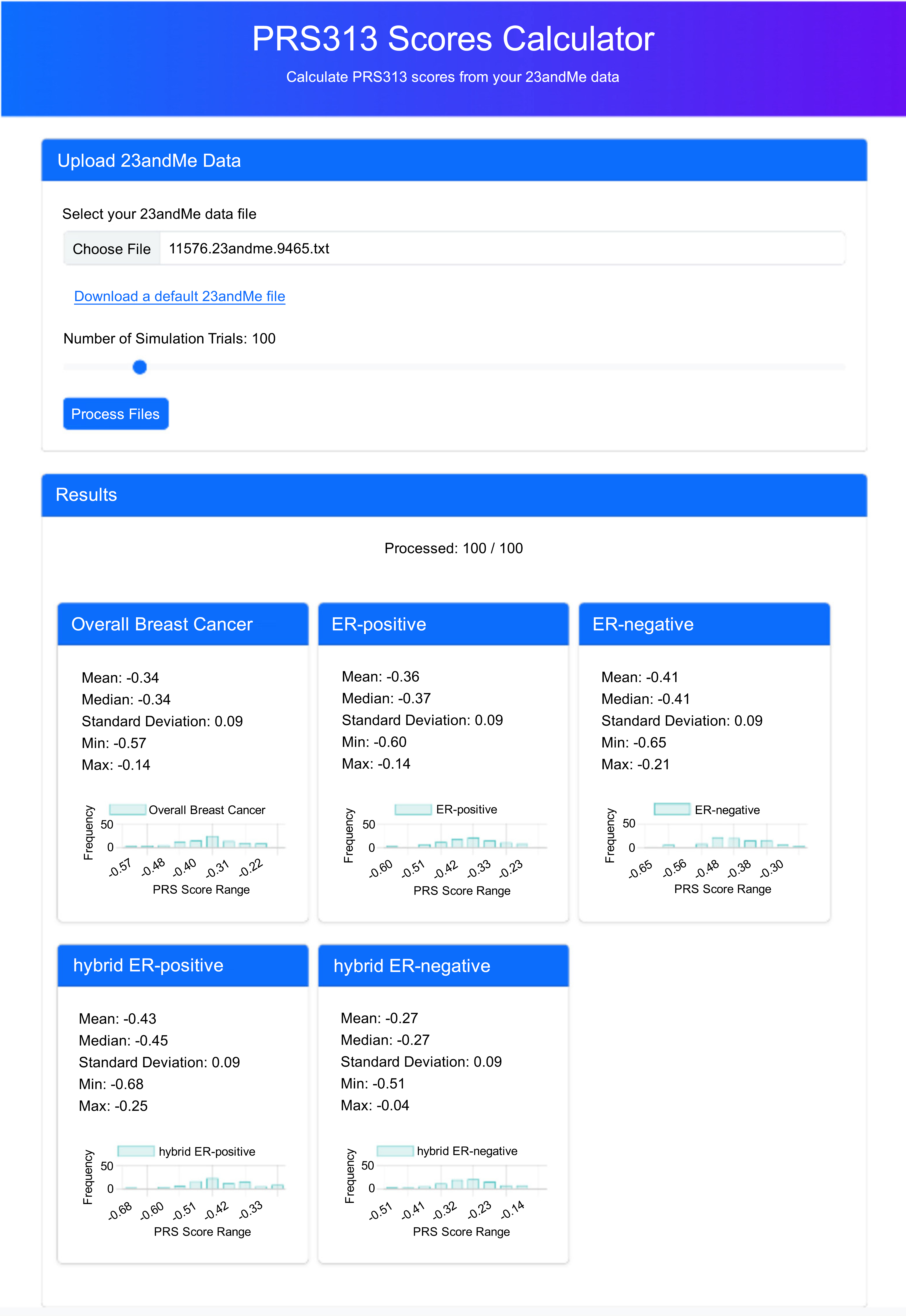 The PRS313_BC Scores Calculator interface. This website displays the results of the PRS calculations for various breast cancer phenotypes based on user's 23andMe genotype data. Users can upload their 23andMe data file and specify the number of simulation trials to process their PRS313_BC scores. The results section displays the processing status and the calculated PRS scores for five breast cancer phenotypes: Overall Breast Cancer, ER-positive, ER-negative, hybrid ER-positive, and hybrid ER-negative. Each phenotype panel includes statistical summaries of the PRS scores, such as mean, median, standard deviation, minimum, and maximum values, along with a histogram showing the distribution of PRS scores across the simulation trials.