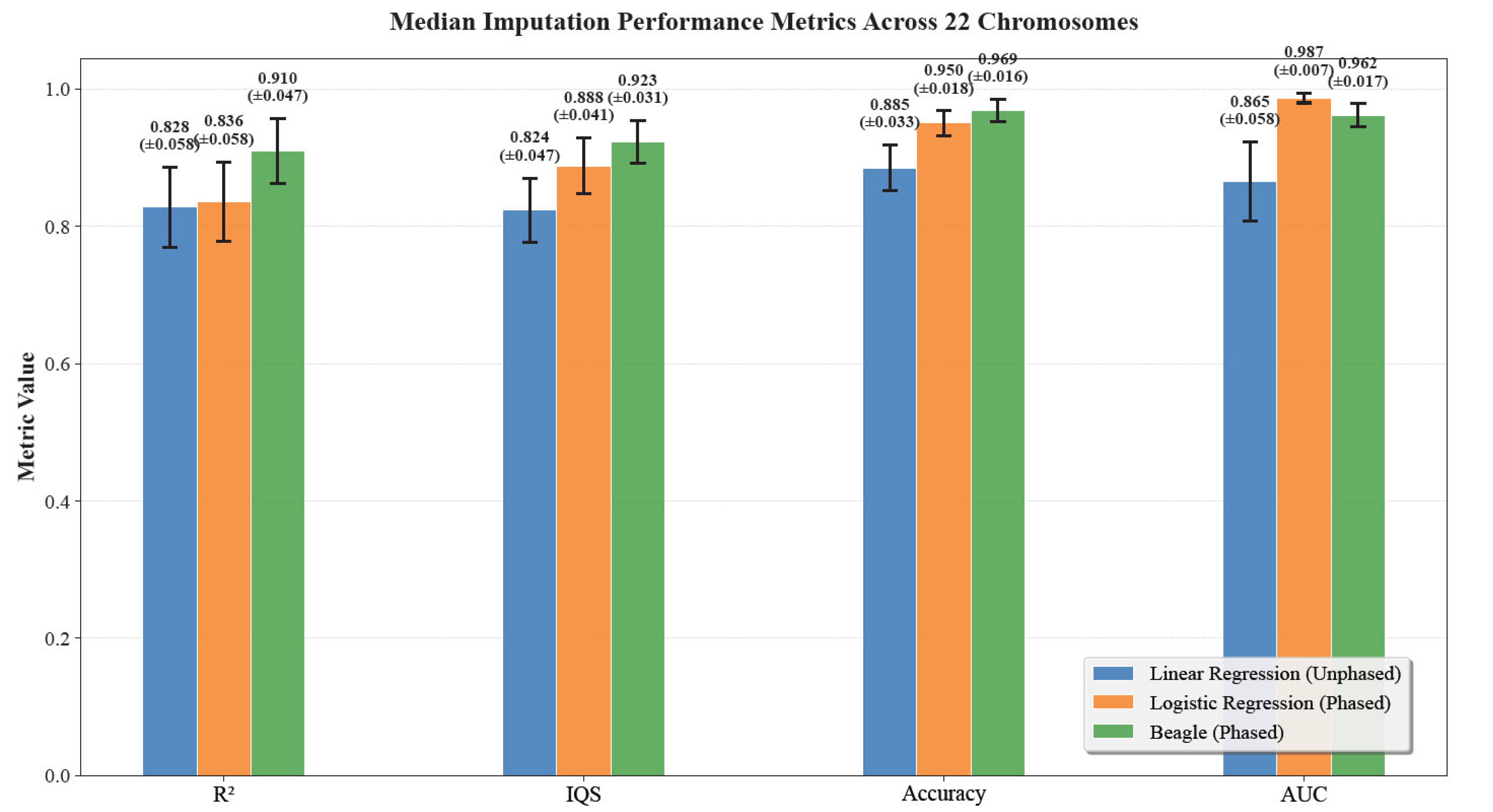For each chromosome, the model was evaluated on its corresponding test set, and performance metrics were calculated by aggregating predictions across all SNPs (micro-averaged for classification metrics like AUC-ROC). The median values of these chromosome-level metrics across all 22 chromosomes are reported in Fig. (4). As shown in Fig. (4), Beagle consistently achieves the highest median values. When assessed using IQS, accuracy, and AUC, logistic Regression (phased) and linear Regression (unphased) perform comparably to Beagle. While the Logistic Regression (phased) achieved a median IQS of 0.888 +/- 0.041 and the Linear Regression (unphased) had an IQS of 0.824 +/- 0.047, Beagle has a median IQS of 0.923 +/- 0.031. However, when assessed using R2, Beagle performs much stronger than the linear methods, with an R2 of 0.910 +/- 0.047, compared to 0.828 +/- 0.058 of logistic regression and 0.836 +/- 0.058 of linear regression.