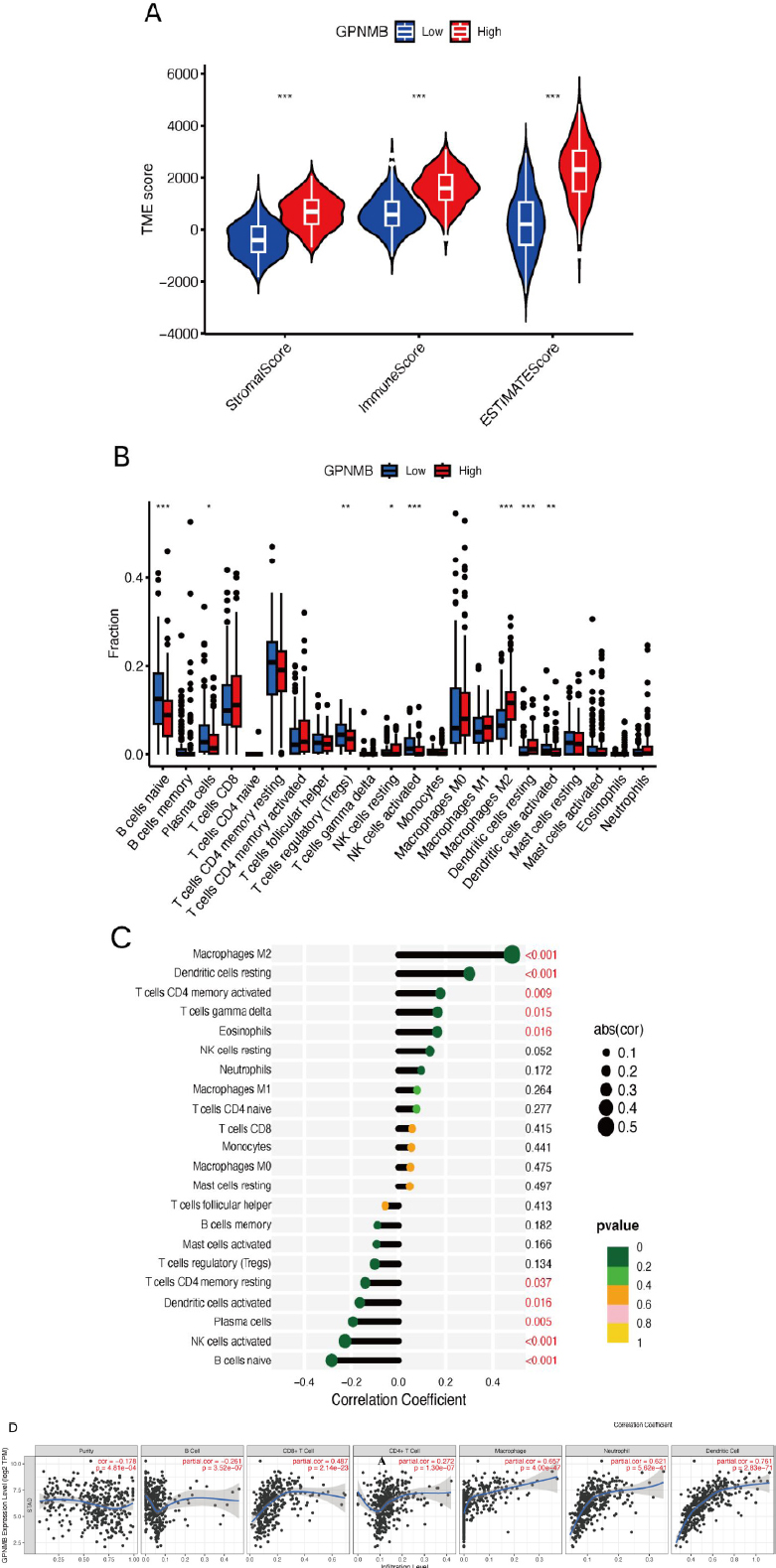 The relationship between GPNMB expression and the tumor immune microenvironment. ((A) Stromal/Immune/ESTIMATEScores; (B-D) Immune cell infiltration (28 subsets) and target correlations).
