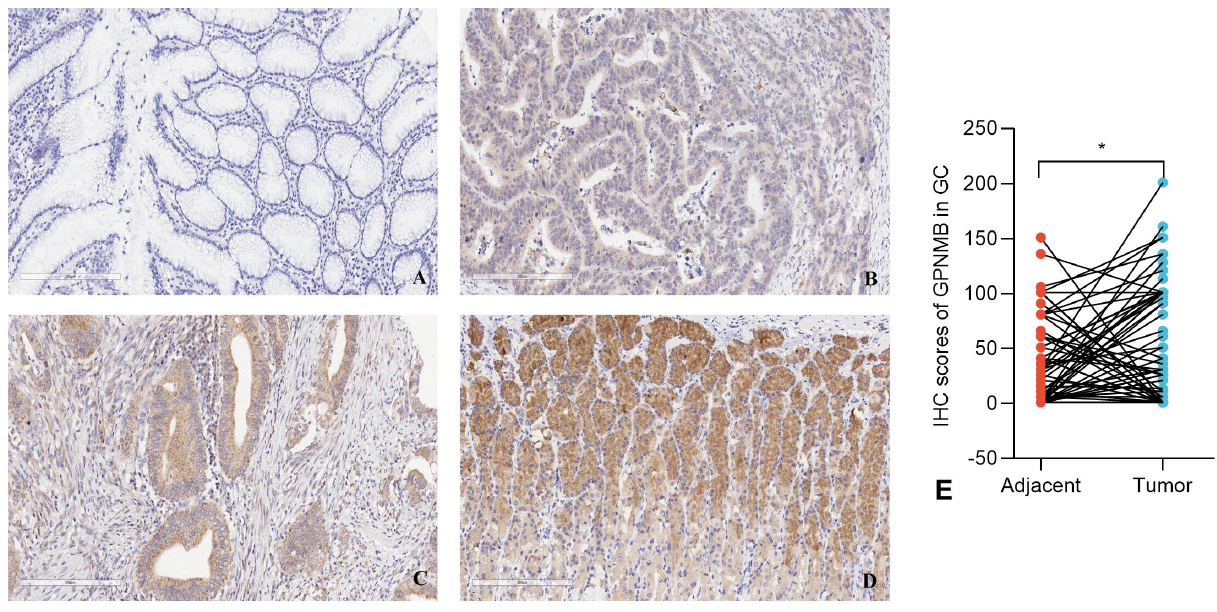 To explore GPNMB’s expression, immune microenvironment association, and prognostic value in GC, this study integrated bioinformatics (TCGA, GEO, GEPIA) and Immunohistochemistry (IHC) on 73 paired GC/adjacent tissues, with semi-quantitative scoring and statistical analyses (chi-square, Mann-Whitney U, log-rank, multivariate Cox regression).