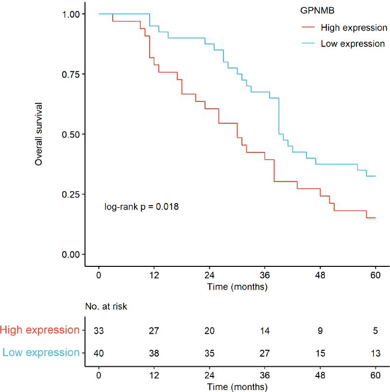 Kaplan-Meier curves (Fig. 8) showed that high GPNMB expression was associated with significantly shorter overall survival (log-rank p = 0.018); median OS was shorter in the high-expression group than the low-expression group.