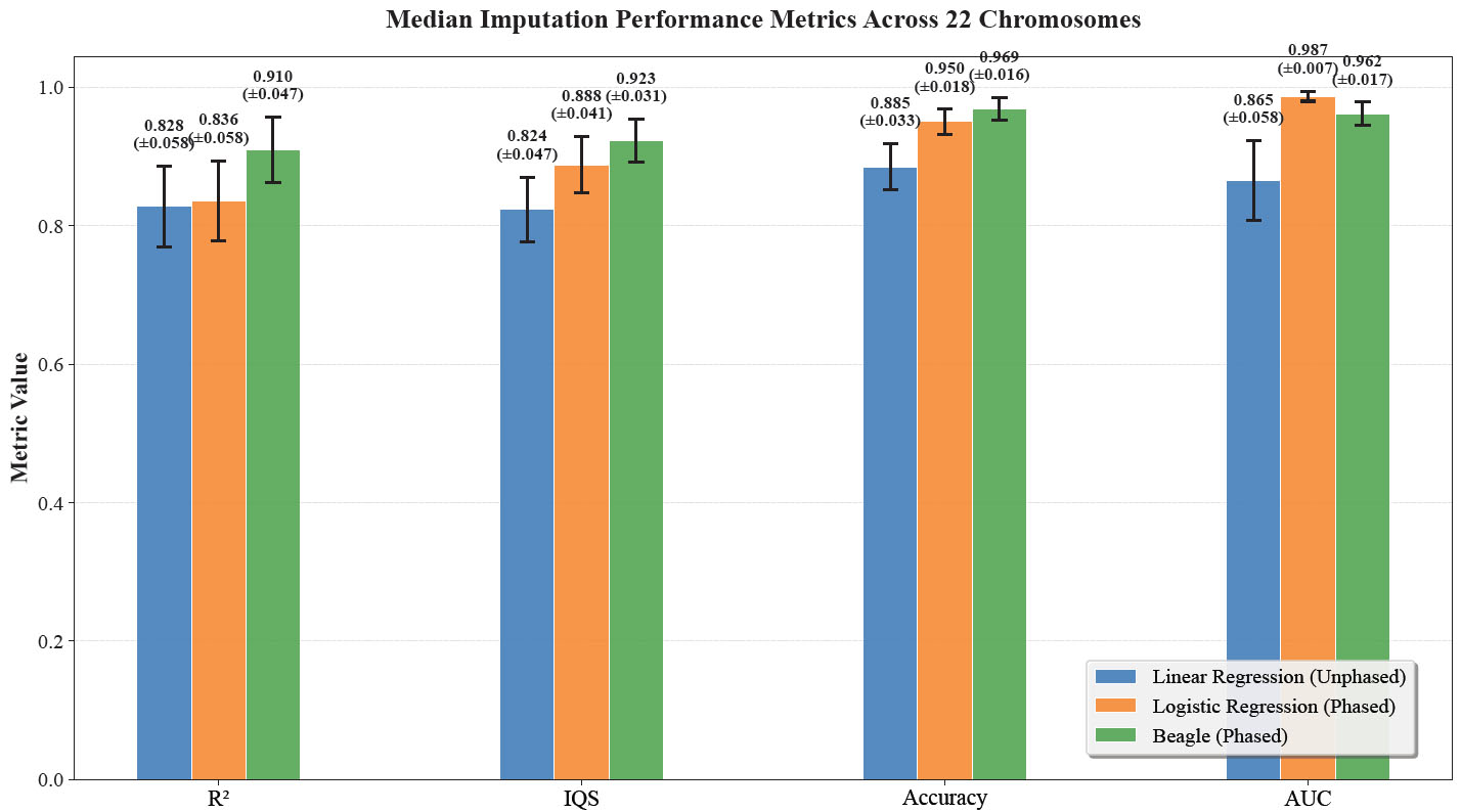 For each chromosome, the model was evaluated on its corresponding test set, and performance metrics were calculated by aggregating predictions across all SNPs (micro-averaged for classification metrics like AUC-ROC). The median values of these chromosome-level metrics across all 22 chromosomes are reported in Fig. (4). As shown in Fig. (4), Beagle consistently achieves the highest median values. When assessed using IQS, accuracy, and AUC, logistic Regression (phased) and linear Regression (unphased) perform comparably to Beagle. While the Logistic Regression (phased) achieved a median IQS of 0.888 +/- 0.041 and the Linear Regression (unphased) had an IQS of 0.824 +/- 0.047, Beagle has a median IQS of 0.923 +/- 0.031. However, when assessed using R2, Beagle performs much stronger than the linear methods, with an R2 of 0.910 +/- 0.047, compared to 0.828 +/- 0.058 of logistic regression and 0.836 +/- 0.058 of linear regression.