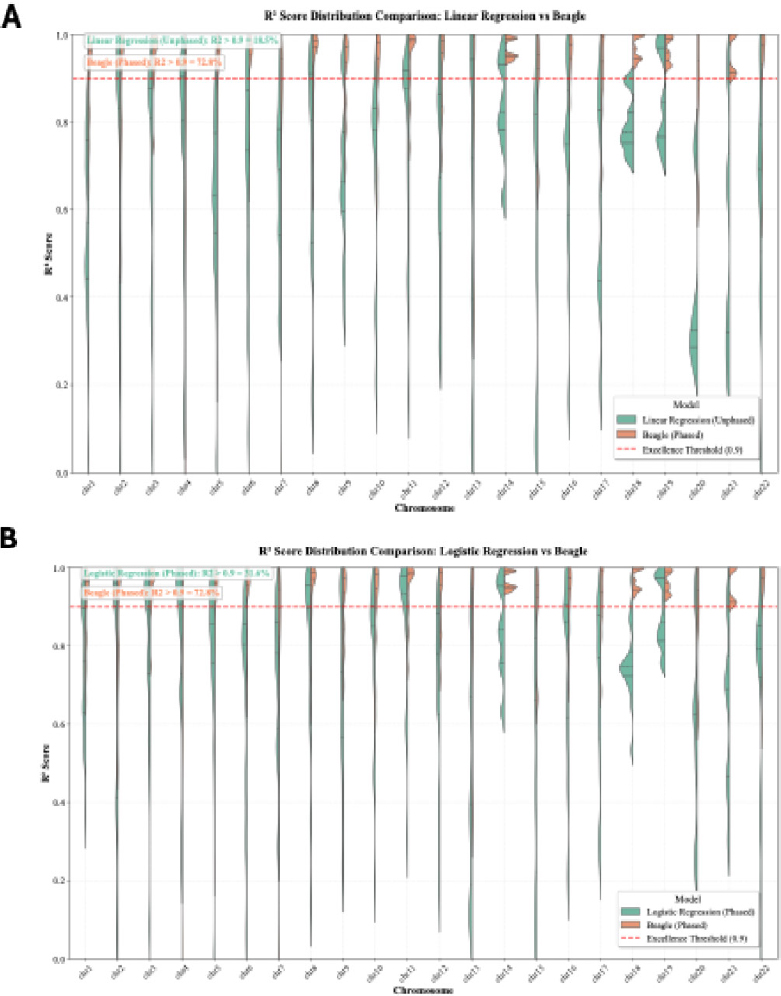 R2 Score Distributions for SNP Genotype Imputation Models across Chromosomes. 5A shows the R2 scores of SNPs imputed using the Linear Regression model trained on unphased data vs. Beagle results imputed using phased data. The violin plots illustrate the distribution across 22 chromosomes. The Beagle model shows a higher proportion of SNPs with R2 > 0.9 (72.84%) compared to the Linear Regression model (18.53%). 5B shows the R2 scores of SNPs imputed using the Logistic Regression trained on phased data vs. Beagle results imputed using phased data. Similar to (A), the Beagle model outperforms the linear method, with 72.84% of SNPs exceeding R2 > 0.9, compared to 31.57% for Logistic Regression.