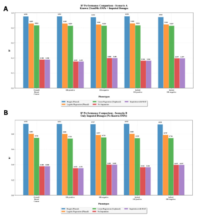 The R2 values, depicted in Fig. (6), compare PRS scores calculated using imputed input genotypes to those calculated with real genotypes. Beagle achieves the highest R2 values across all phenotypes, with an R2 of 0.95 for overall breast cancer, indicating a strong correlation between imputed and actual genotypes. However, it is noteworthy that the baseline models—Logistic Regression (phased) and Linear Regression (unphased)—also perform surprisingly well. For instance, Logistic Regression achieves an R2 of 0.86 for overall breast cancer, only slightly lower than Beagle. These models significantly outperform the PRS score calculated without imputation and the Imputation with MAF method, both with an R2 of 0.38.