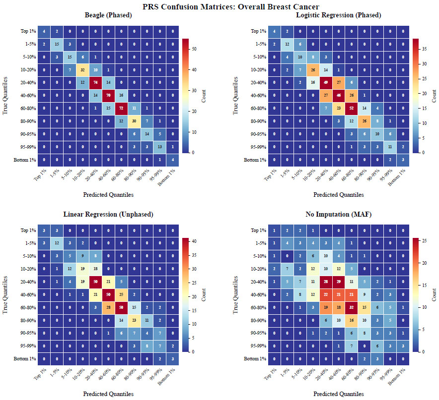 The confusion matrices in Fig. (7) illustrate the agreement between true and predicted quantiles for overall breast cancer risk using PRS313_BC scores. As shown in Fig. (7), out of the six test-set subjects in the top 1% of PRS scores, both the logistic regression model and Beagle correctly classified 4 out of 6. The linear regression model correctly classified 3 out of 6, while imputing with MAF only led to 1 out of 6 being correctly classified. For the misclassified patients in the top 1% of PRS scores, Beagle, linear regression, and logistic regression placed all of them in the next highest score quantile (1-5%). In contrast, imputing with MAF placed 2 out of 6 patients in the 5-10% quantile and 1 out of 6 in the 10-20% quantile.