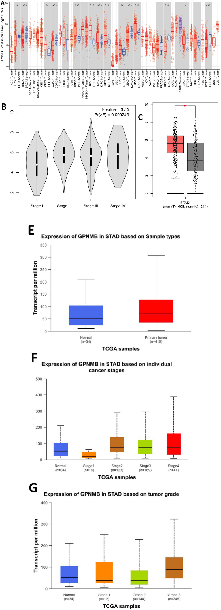 Figure 1 showed that GPNMB was aberrantly expressed in multiple tumors: in Stomach Adenocarcinoma (STAD), GPNMB mRNA was significantly upregulated compared to normal tissues.
