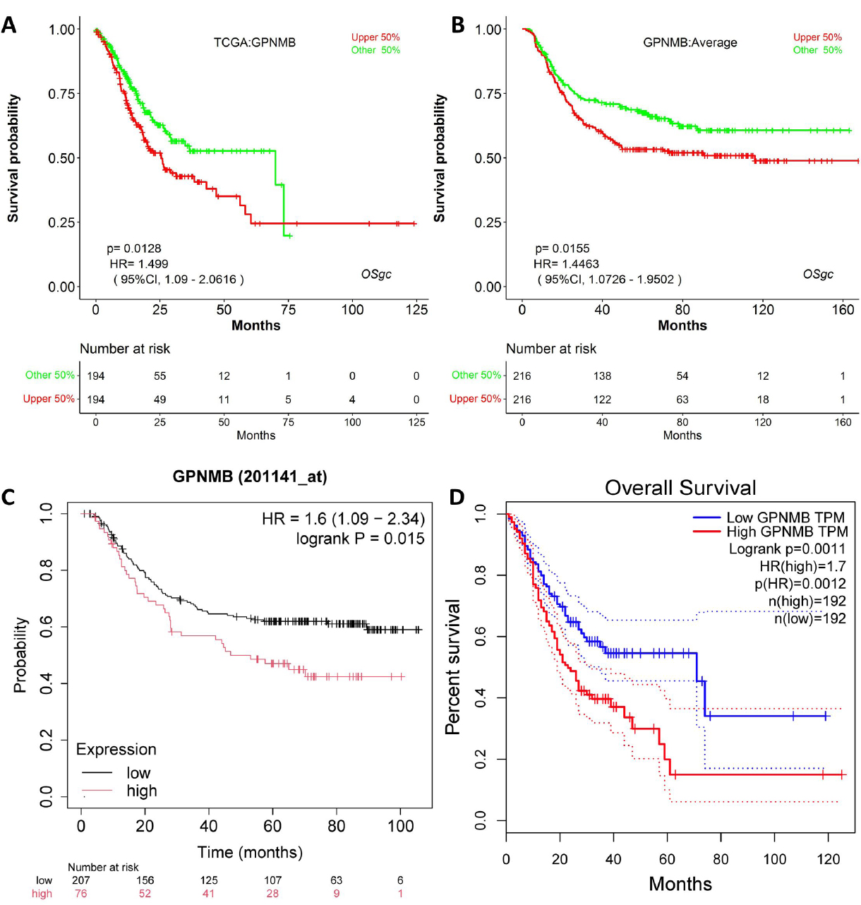 (Kaplan-Meier OS curves (TCGA/GSE26253/GSE62254/ GSE54129); high GPNMB correlates with shorter OS (p < 0.05, HR = 1.499–1.7)).