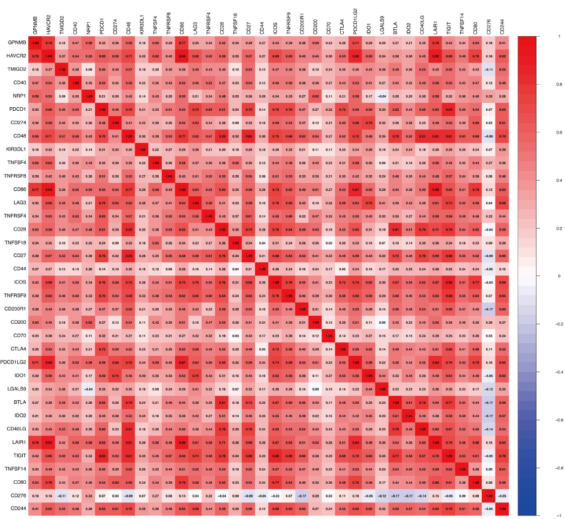 The heatmap of GPNMB and immune cell - related markers. (Y-axis: GPNMB and 30 immune checkpoints/T-cell markers; X-axis: the same set of genes; color gradients indicate Pearson correlation coefficients (red = positive, blue = negative)).