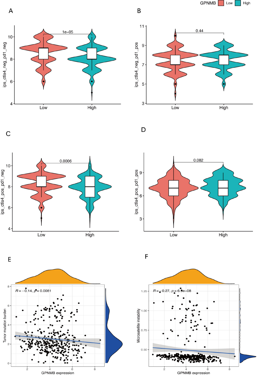 This set of figures contains 6 sub-figures. Figure 5A-D are violin box plots that group samples based on GPNMB expression and show differences in the distribution of different immune-related indicators. Figure 5E and F are scatter plot, displaying the linear associations between GPNMB expression and specific immune indicators. The P-values and correlation coefficients (r) are used to quantify the strength of these associations.